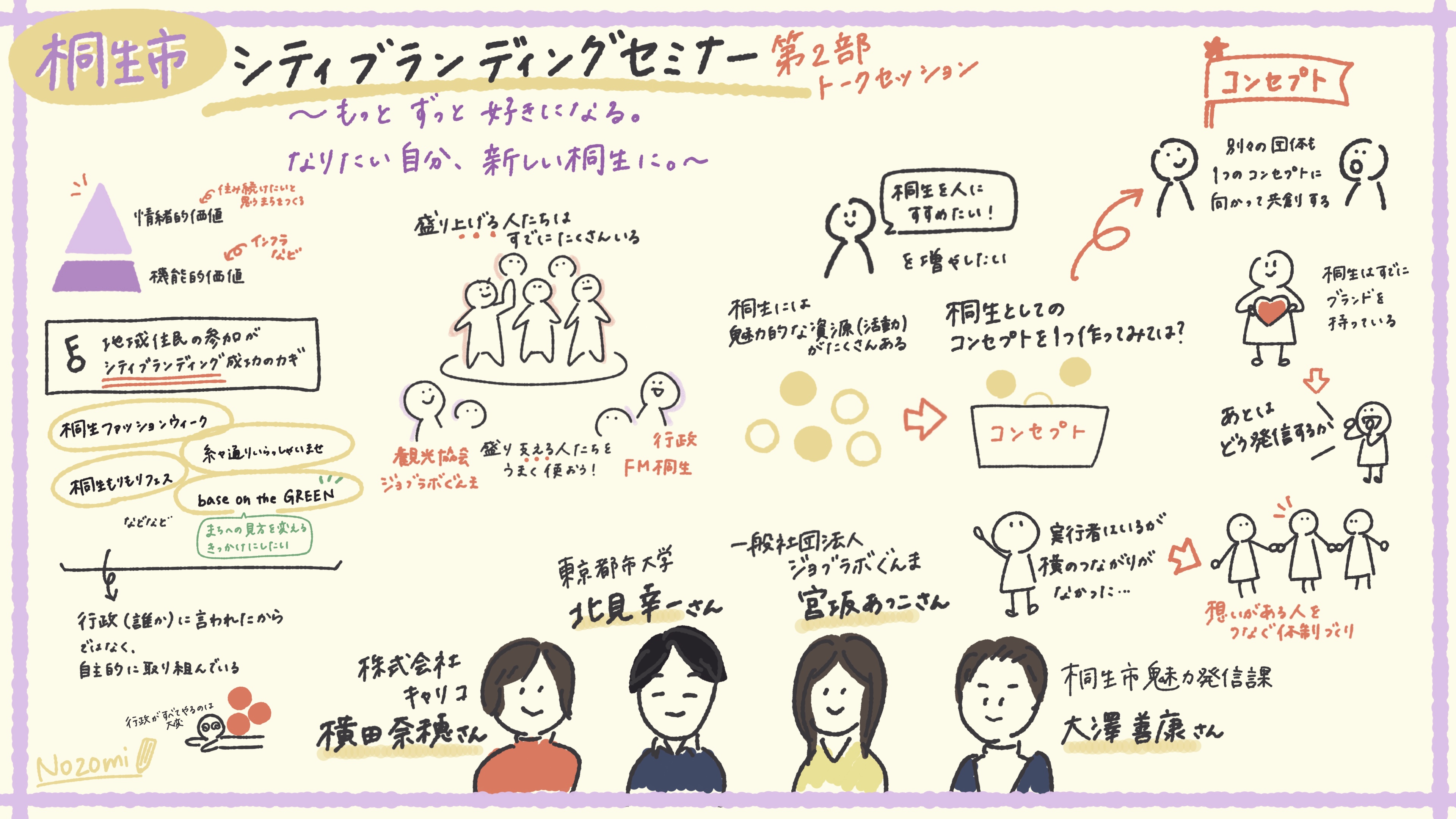 今回行われたセミナーは2部構成で、 第1部でシティブランディングやシティプロモーションについて、東京都市大学の北見教授とモデレーターの横田さんと一緒に学んだ後、第2部で「桐生市では何ができるだろう?」「私には何ができるだろう?」ということを登壇者の皆さんと一緒に考えていく、という流れでした。