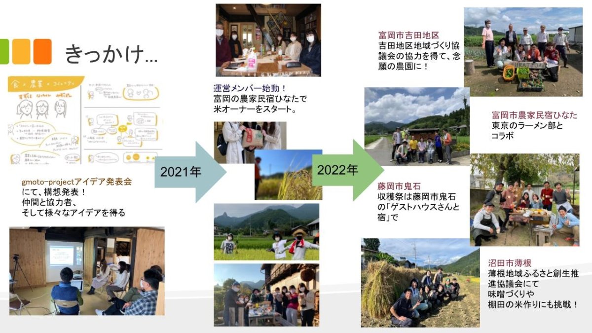 2022年度では、農家民宿ひなたからのご縁で出会った富岡市吉田の「吉田地区地域づくり協議会」の協力のもと、地域の耕作放棄地をお借りして念願の農園を持ち、野菜づくりに挑戦。毎週当番で作業に行き、多種多様な作物を、嬉しいことに毎回豊作の収穫ができています。 さらに、「農家民宿ひなた」とのつながりで東京のラーメン部と一緒に活動したり、藤岡市鬼石「ゲストハウスさんと宿」で収穫祭を開催したり、沼田市薄根「薄根地域ふるさと創生協議会」の稲作オーナーで棚田で米作りをしたり、と地域を広げて様々な人に出会い、活動することができました。