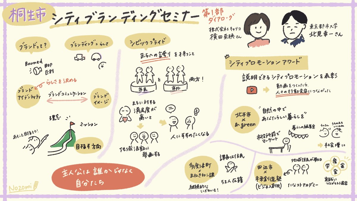 今回行われたセミナーは2部構成で、 第1部でシティブランディングやシティプロモーションについて、東京都市大学の北見教授とモデレーターの横田さんと一緒に学んだ後、第2部で「桐生市では何ができるだろう?」「私には何ができるだろう?」ということを登壇者の皆さんと一緒に考えていく、という流れでした。
