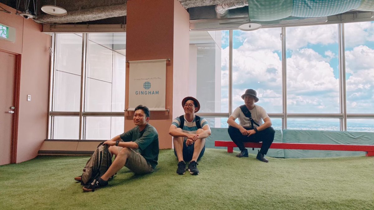 県庁の新しいスポット「GINGHAM(ギンガム)」をみんなで見学しました。 こちらは今後の企画を妄想している様子です。天気も良かったので、芝生も調子良さそうでした。
